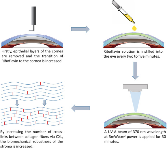 The cornea is then exposed to UV-A light for about 30 minutes. The combination of riboflavin and UV-A light induces the formation of new collagen cross-links.